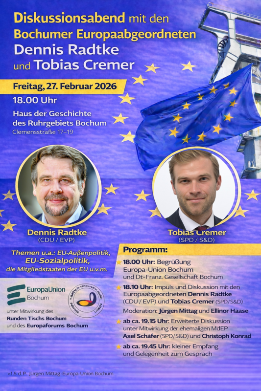 Am Freitag, 27. Februar 2026, um 18:00 Uhr diskutieren im Haus der Geschichte des Ruhrgebiets in der Clemensstraße 17–19 in Bochum die beiden Europaabgeordneten Dennis Radtke (CDU/EVP) und Tobias Cremer (SPD/S&D) über aktuelle europäische Themen. Im Mittelpunkt stehen die zentralen Herausforderungen der europäischen Integration, insbesondere die internationale Rolle und Sicherheitspolitik Europas, die Entwicklung der Demokratie in den Nationalstaaten sowie Fragen sozialer Reformen und des gesellschaftlichen Zusammenhalts.