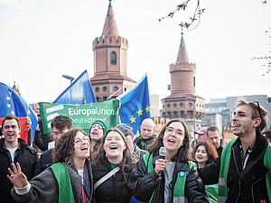 Aus voller Kehle: "Zusammen für Europa" Kundgebung am ehemaligen Berliner Mauerstreifen. Foto: Lutz Gude / JEF Deutschland (CC-BY-SA)