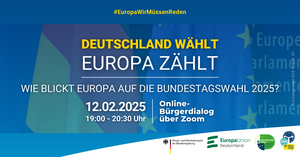 Herzliche Einladung zu unserem Online-Bürgerdialog "Deutschland wählt, Europa zählt! Wie blickt Europa auf die Bundestagswahl 2025?" am 12. Februar 2025.