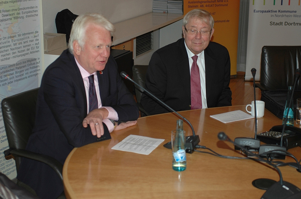 Bernhard Rapkay, Beauftragter des Oberbürgermeisters der Stadt Dortmund für Internationales und Europa und Mitglied des Europaparlaments von 1994 bis 2014, sprach im Dialog mit Jan Pogadl zum Thema: „Die Auswirkungen der Wahl zum Europaparlament auf die Europäische Union“.