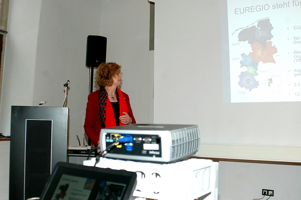 Frau Dr. Elisabeth Schwenzow stellte die Euregio in einer interessanten und detailierten PowerPoint-Präsentation vor. Schwenzow erläutert die Ziele der EUREGIO und die Möglichkeiten der Zusammenarbeit Niederländischer und Deutscher Behörden.